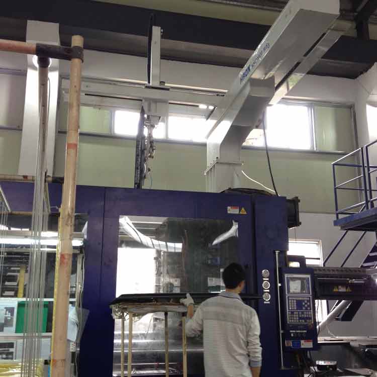 上下、横出入、上下手臂全伺服马达驱动的一款注塑机使用的机械手,定位精准,可以完成多项动作,引拔、横出入,上下手臂行程可以在一定的范围内调整距离。可以根据客户需要编程动作,操作简单,免费培训使用人员。安全生产,节省人工!就是一个机器人在24小时不知疲倦的工作!